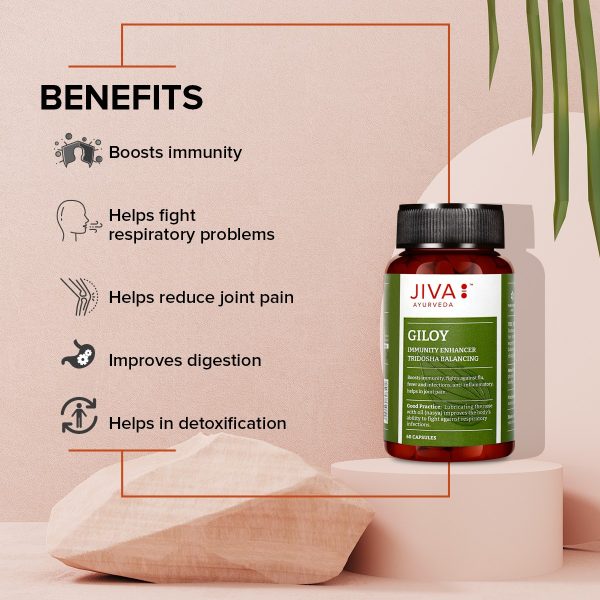 Jiva Giloy Capsules are empowered with the numerous health benefits of the Ayurvedic wonder-herb Giloy (Guduchi), also known as Tinospora cordifolia. Giloy being an immunomodulator herb enhances the immunity of the body by stimulating the white blood cells which are responsible for the prevention of infections. Giloy herb is also a powerhouse of antioxidants that are plant compounds and can fight off free radicals and prevent oxidative damage to cells. Giloy also has anti-allergic, anti-viral, antibacterial properties and helps in controlling cold, cough, fever and allergies. It helps in maintaining respiratory, joints and gut health.
