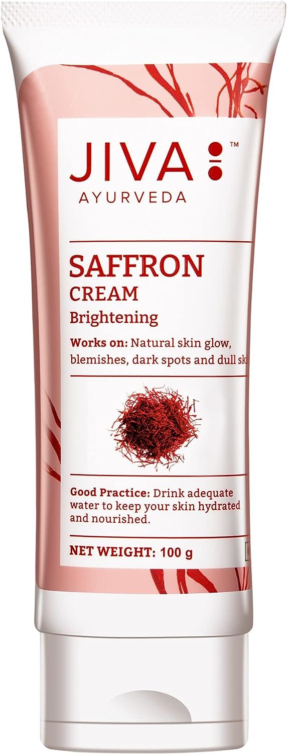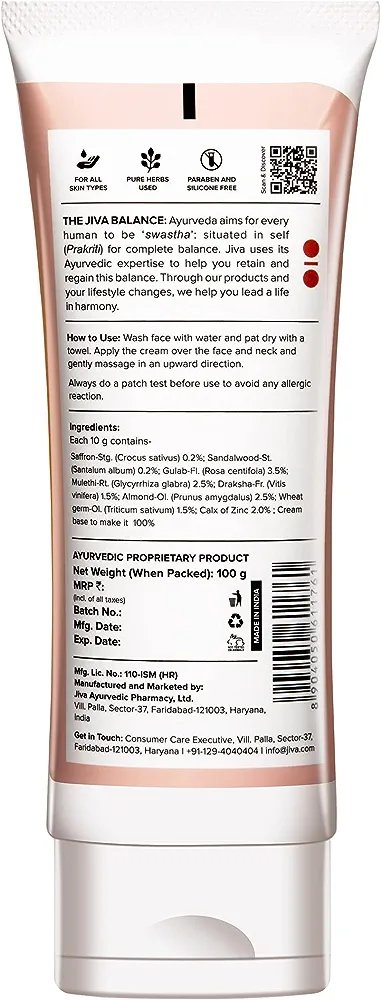 Jiva Saffron Cream contains a unique blend of Saffron, Sandalwood, Gulaab, Mulethi, Draksha, Almond Oil and Wheat Germ Oil. This combination of potent Ayurvedic herbs helps clear blemishes, dark spots, and scars. Made with pure herbs extract and oil, this cream is suitable for usage for all skin types. It is paraben and silicone-free. In Ayurveda, Saffron is put under ‘varnya gana’ category. Herbs under this category are known to provide skin with a warm, glowing complexion. Therefore, this cream helps brighten the skin naturally and makes it softer and smoother. Mulethi contains antioxidants like glabridin and licochalcone which are soothing to the skin, reduces the formation of pigmentation and also help fight ageing. Almond Oil has excellent emollient properties. It helps the skin balance water loss and absorption of moisture. Wheat Germ Oil is a great source of Vitamin B6, Folic acid and Vitamin E and acts as an anti-ageing agent for the skin.