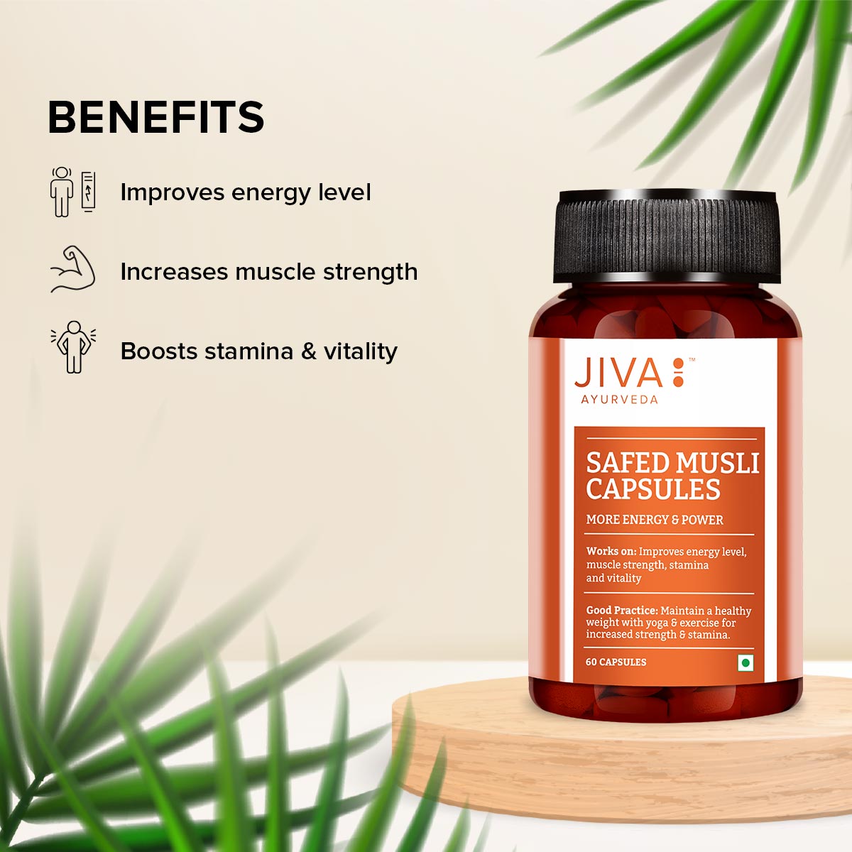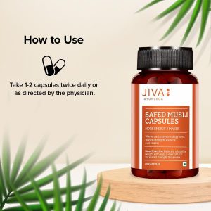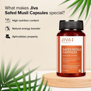 Jiva Safed Musli Capsules offers you the goodness of potent Ayurvedic herb Safed Musli. It is widely popular in Ayurveda for its abundant medicinal properties. Its aphrodisiac property helps in improving sexual function by boosting energy levels and increasing muscle strength. It addresses issues such as erectile dysfunction, loss of libido, and infertility when consumed regularly. Its vata balancing property helps in reducing stress levels and anxiety issues, which has a direct impact on sexual performance. It also has an antioxidant property that reduces free radicals in the body and minimises the risk of oxidative stress-induced disorders and boosts immunity.